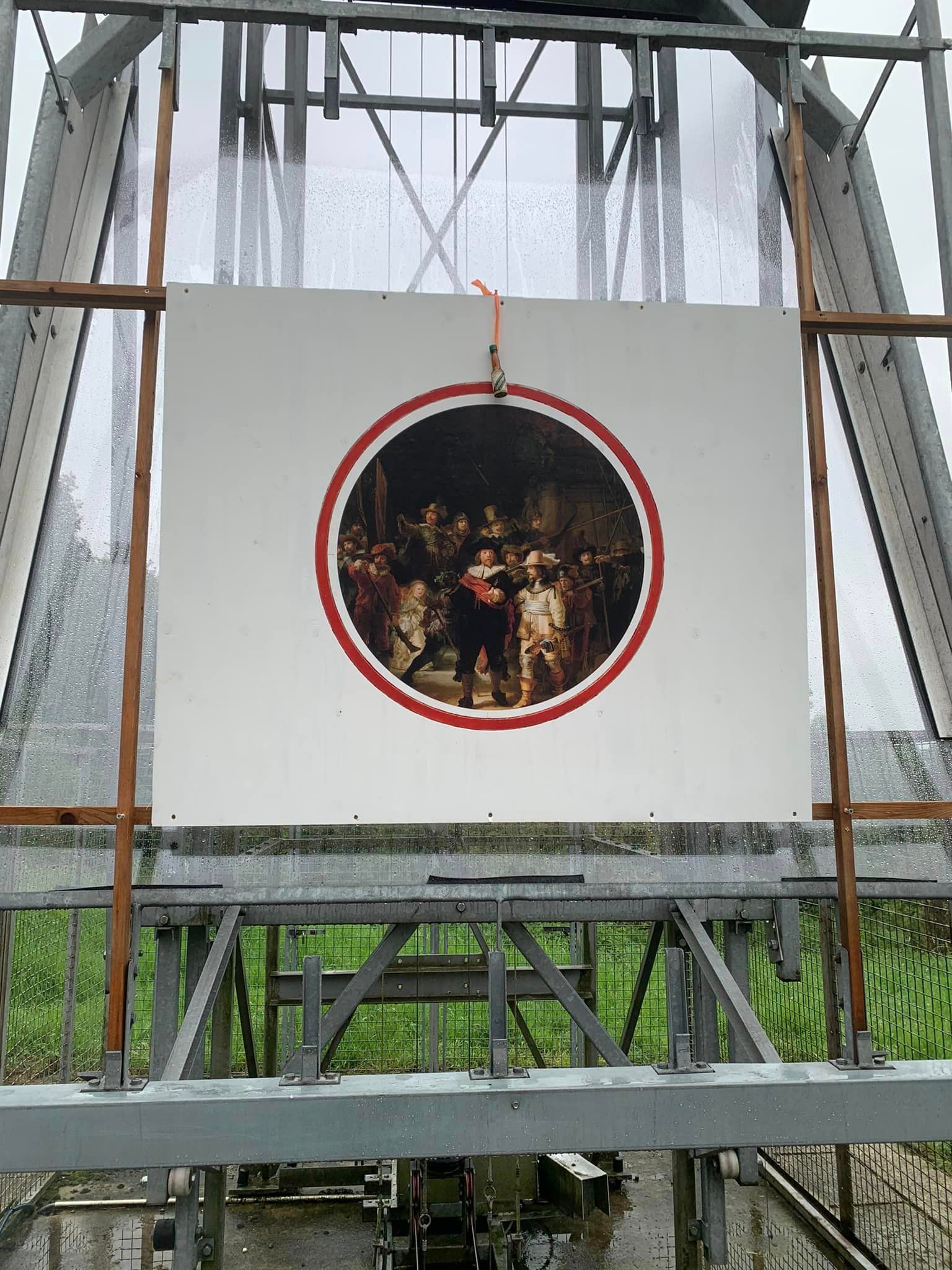 Overigens is dit jaar gebroken met een traditie, er stond geen vogel in de top van de schietmast maar dit keer schoten we op het schilderij dat ons zo bekend is. Beetje bij beetje werd de rode rand rondom de Nachtwacht minder zichtbaar. De spanning werd groot toen de plaat bij elk schot een soort van dansje deed. Uiteindelijk viel hij achterover in plaats van voorover. En toen hij zich ook nog eens vast zette onder in de kogelvanger was het niet meer veilig om door te schieten en daarom werd besloten dat de laatste schutter zich tot koning mag kronen. Dit was dus Jos Janssen, al jaren steevast kandidaat voor de koningstitel. Met bulderende saluutschoten werd Jos ingewijd als koning.
